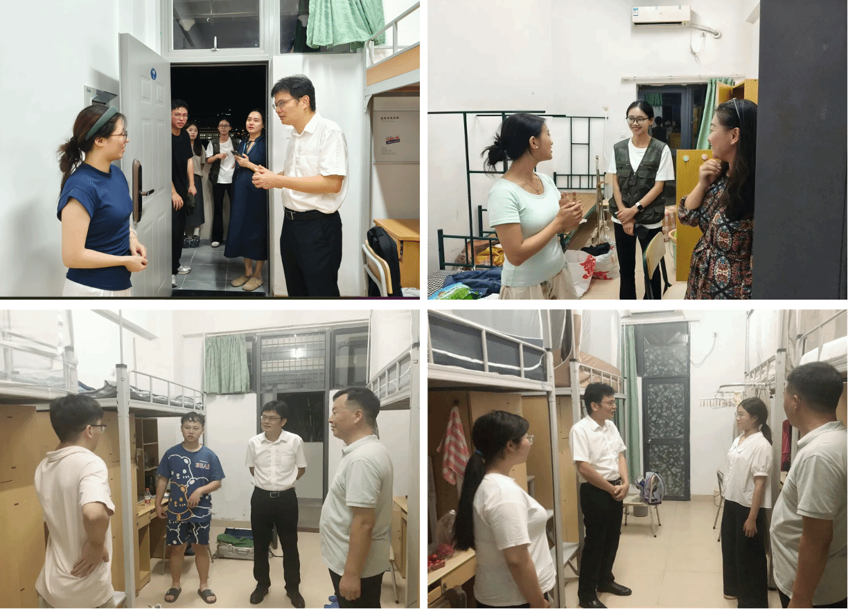 当天晚上,学院党委书记王晟,党委副书记蔡虎堂、王旖旎带领新生辅导员一同走访了新生宿舍,及时了解同学们的入住情况,现场协调解决困难,送上学院的问候与关怀。“宿舍还住得习惯吗?”“还有什么需要帮助的地方?”一句句贴心问候,拉近了师生之间的距离,面对新生提出的生活细节或学业规划疑问,老师们也一一耐心解答,同时鼓励新生尽快适应校园环境,积极融入环生集体。一句句叮嘱、一次次倾听,让远离家乡的新生感受到了家的温暖,也让学院的关怀落到了实处。