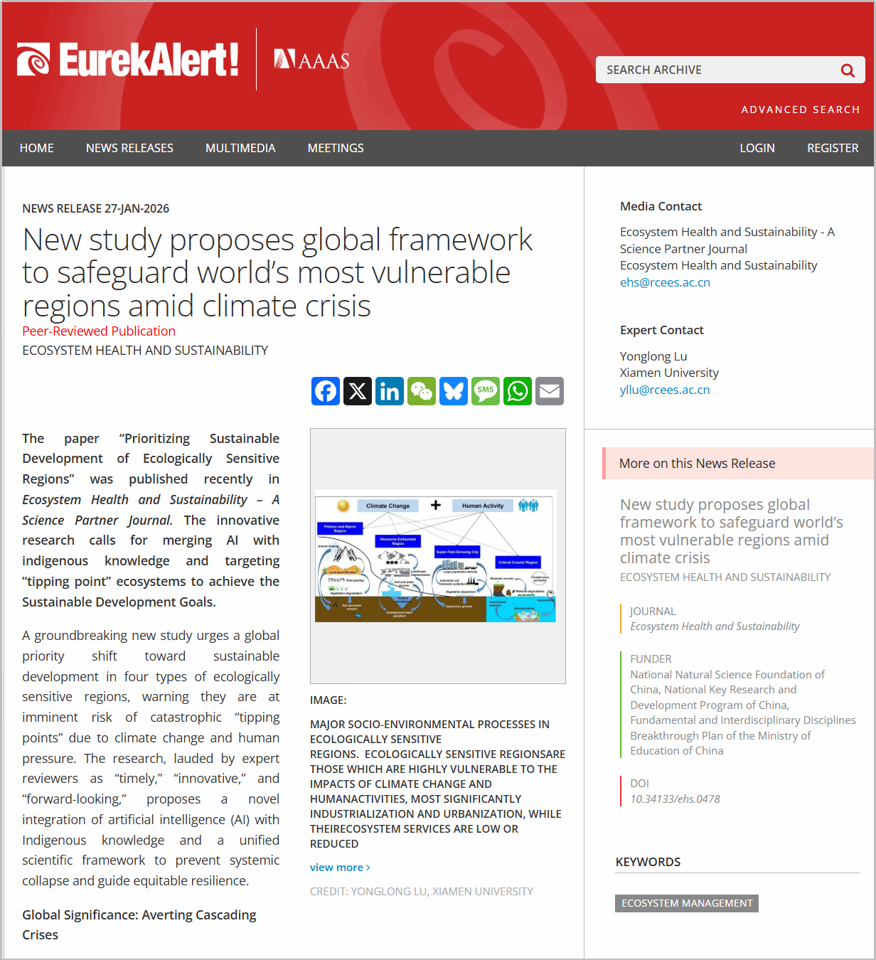 文章发表当天,美国科学促进会(AAAS)以“New study proposes global framework to safeguard worlds most vulnerable regions amid climate crisis”为题对该文进行报道。