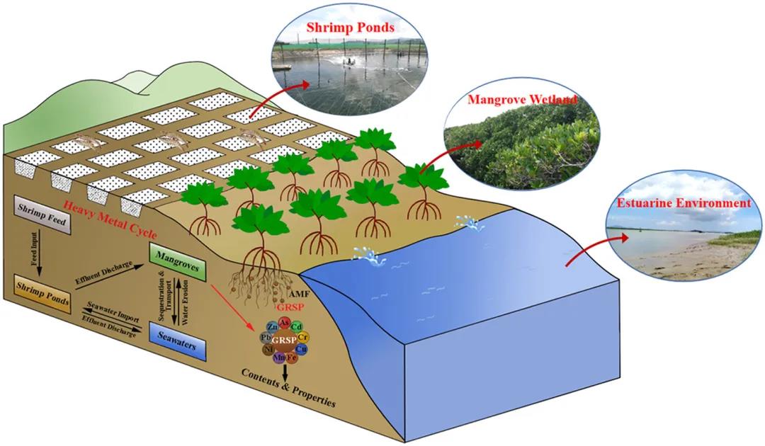 球囊霉素相关土壤蛋白(glomalin-related soil protein, GRSP)源自全球广泛分布的丛枝菌根真菌。GRSP是一种耐分解的有机质组分,它可与土壤、水体中的重金属结合,在物质的陆—海传输过程中发挥着重要的生态功能,受到越来越多的关注。红树林湿地是海岸带重要的生态系统,可以“捕获”大量的陆源物质,比如GRSP。然而,目前人们对于红树林湿地附近水产养殖活动中金属元素的陆—海运输路径以及GRSP在其中发挥的生态功能和生物指示作用还缺乏认知。