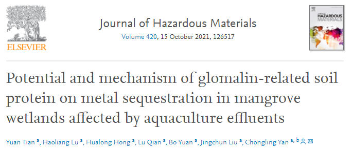 最新成果以“Potential and mechanism of glomalin-related soil protein on metal sequestration in mangrove wetlands affected by aquaculture effluents”为题发表在Journal of Hazardous Materials期刊上。博士生田园为第一作者,严重玲教授为通讯作者,该研究得到了科技部重大研究计划和国家自然科学基金的资助。