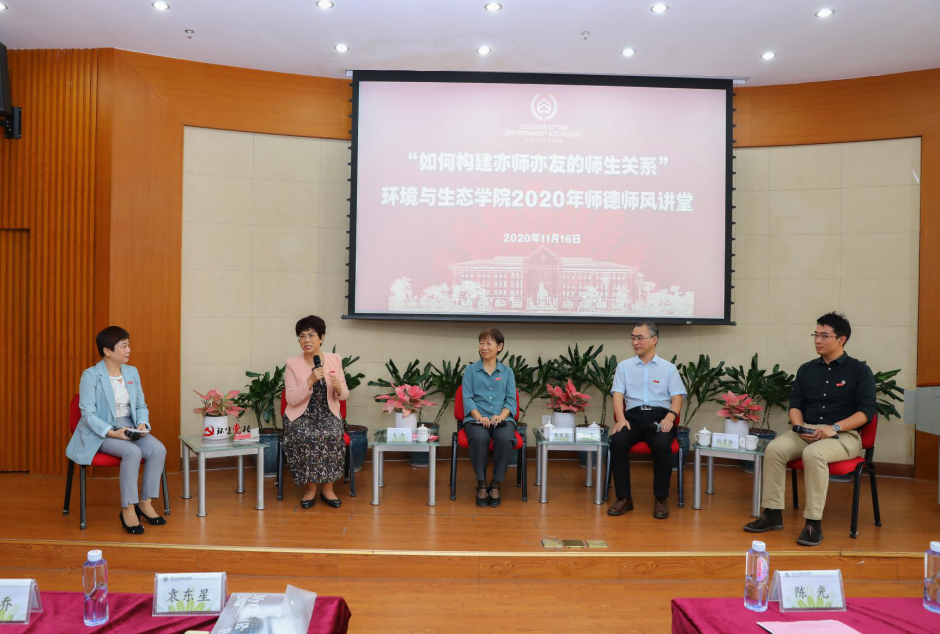 11月16日下午,环境与生态学院2020年师德师风讲堂在金泉楼B103报告厅举行。此次讲堂以对话的形式,邀请生命科学学院吴乔教授,环境与生态学院袁东星教授、于鑫教授、张彦隆副教授一起围绕“如何构建亦师亦友的师生关系”这一主题,展开对话和交流。活动形式新颖、妙趣横生,有思考、有对话、有共鸣、有欢乐,现场气氛活跃,在场师生深受感染。