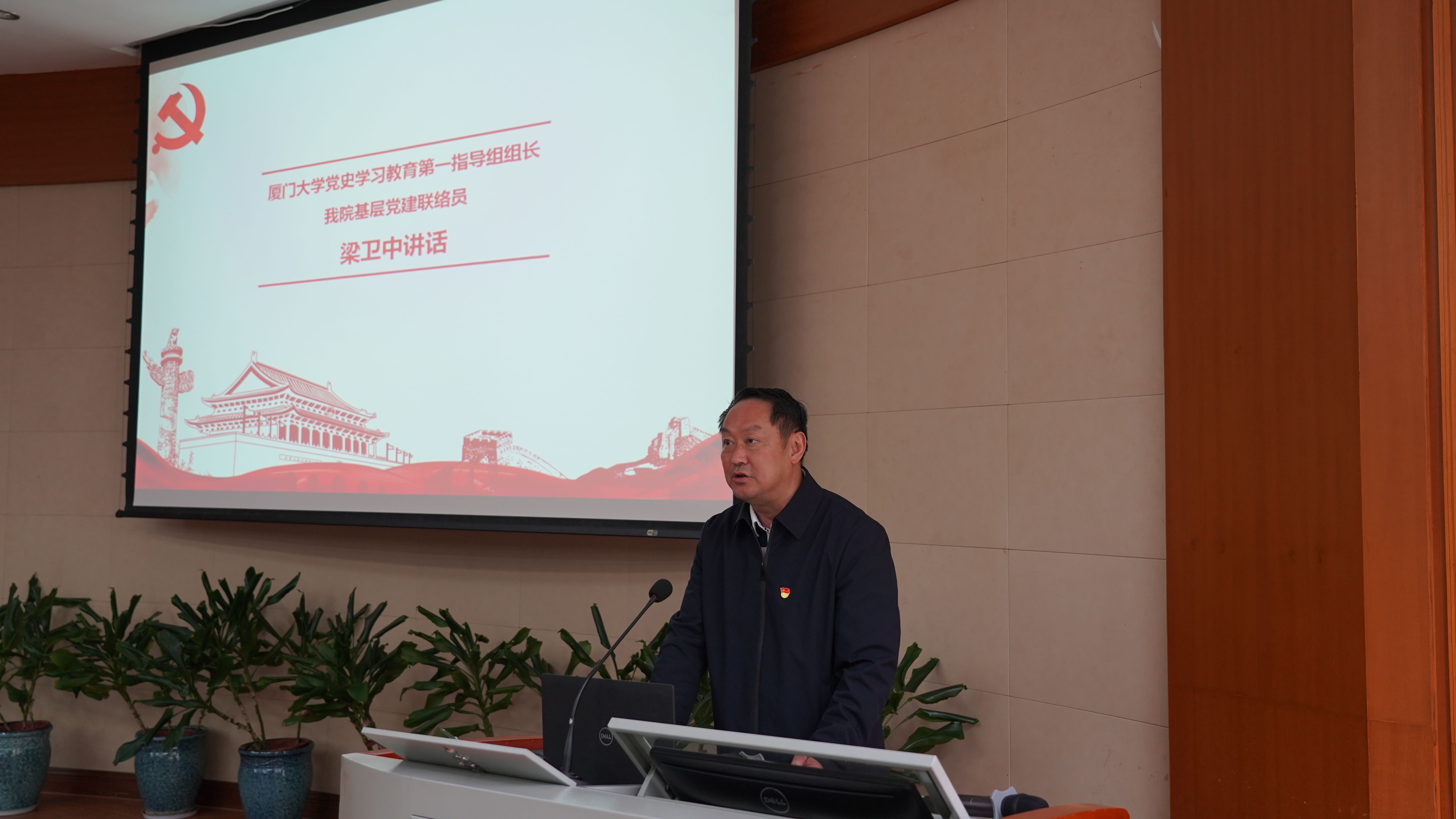 梁卫中作指导讲话。他代表校党史学习教育指导组提出三点要求,一要提高政治站位,以高度的政治自觉、思想自觉和行动自觉开展党史学习教育,引导广大党员从建党百年历史中汲取精神力量,自觉将“个人梦”“厦大梦”融入中华民族伟大复兴的中国梦;二要坚持目标导向,抓实重点任务,结合学院特色、师生特点开展活动,确保党史学习教育取得实效;三要强化主体责任,加强组织领导,以严的作风保障党史学习教育高质量开展。