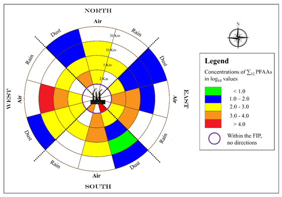 图2 空气、降尘和降水中PFAAs的大气扩散对比