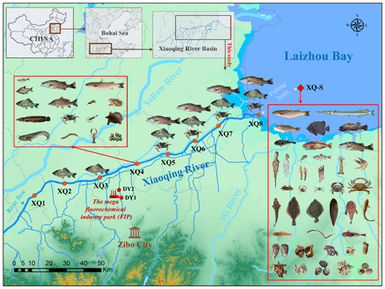 图1 受氟化工排放直接影响的小清河下游至莱州湾近海典型水生生物样品分布