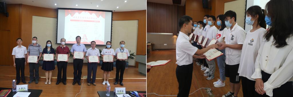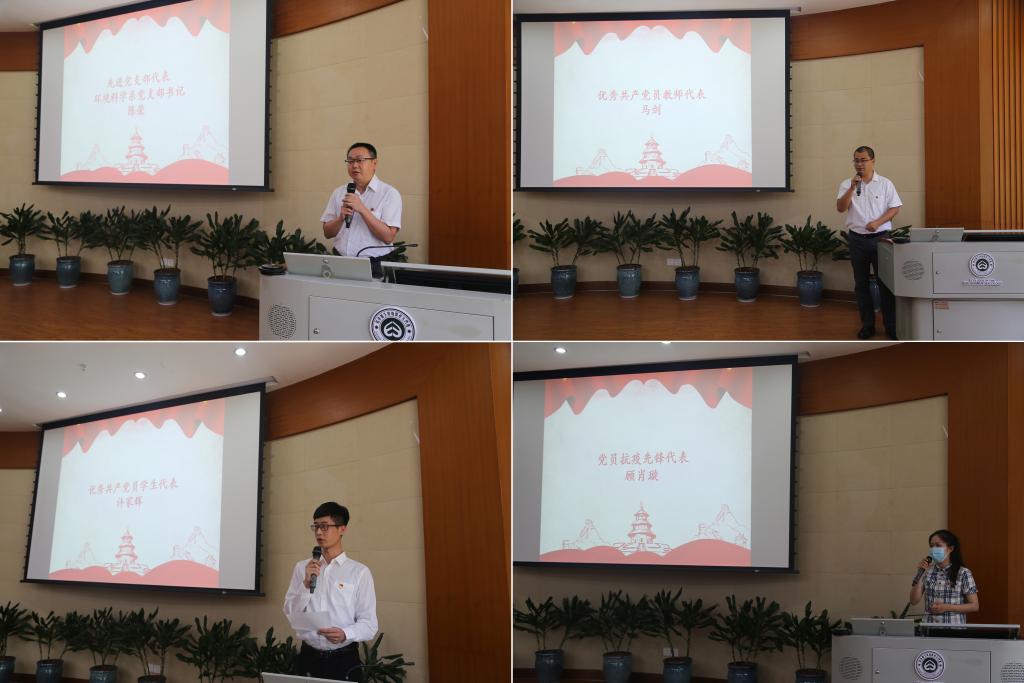 李静、曹文志、王新红、黄凌风、校第十一次党代会党代表周克夫为获得表彰的先进集体和个人代表颁发荣誉证书。先进党支部代表陈荣、优秀共产党员教师代表马剑、优秀共产党员学生代表许家辉、党员抗疫先锋代表顾肖璇4位同志依次做经验交流发言。