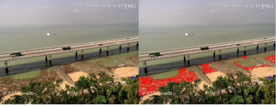基于视频监控图像的海漂垃圾信息提取(左图:视频监控原图,右图:图像识别结果)