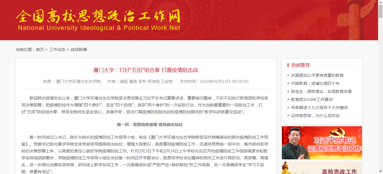 2月23日,全国高校思想政治工作网刊发题为《厦门大学:打好“五招”组合拳 打赢疫情阻击战》文章,深入介绍我院开展新冠肺炎疫情防控工作的做法和成效。