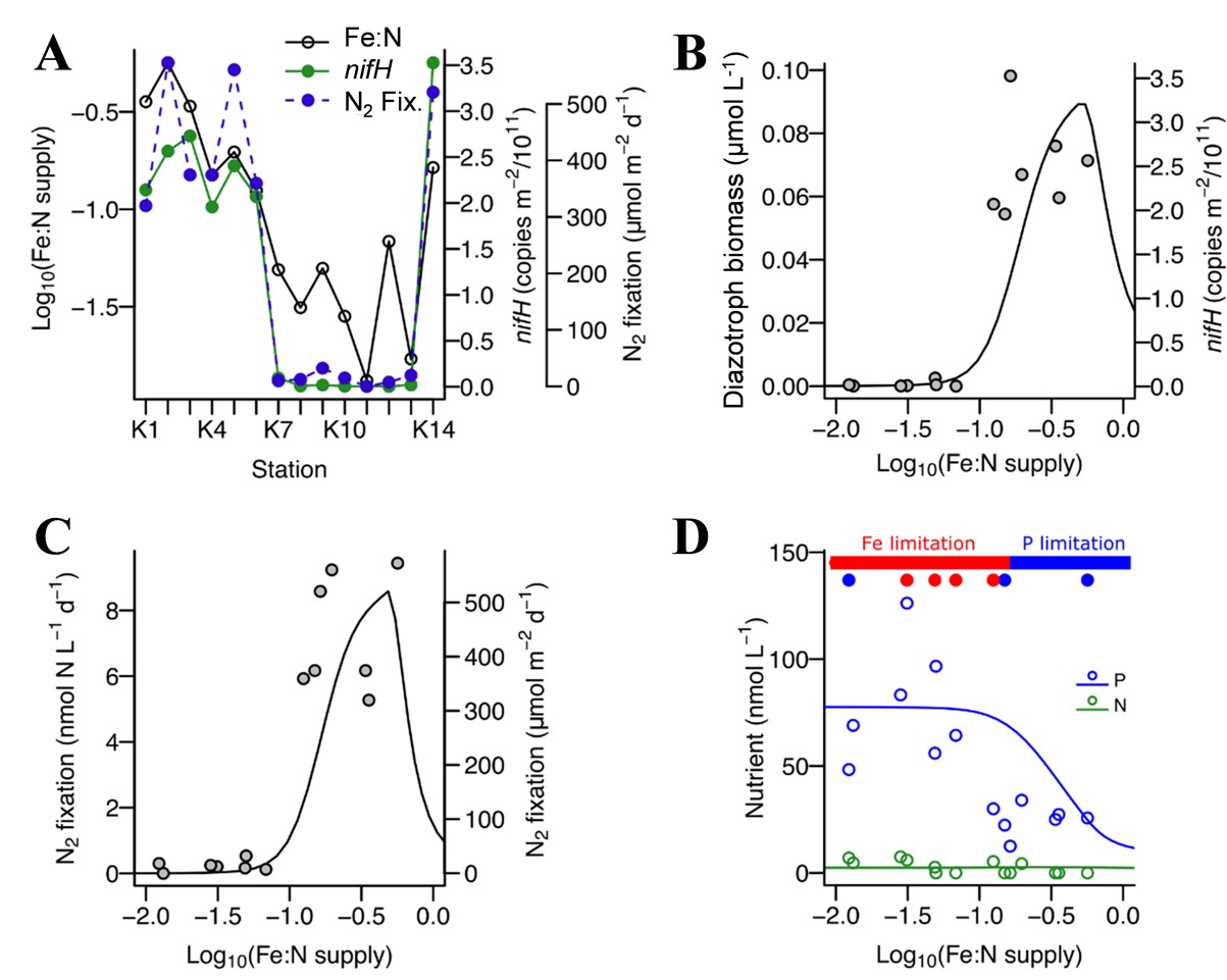 (A)Fe:N供给比例与固氮速率和固氮生物丰度的相关性;(B)和(C)资源竞争模型输出结果与观测的吻合;(D)模型输出的营养盐限制与现场试验结果吻合。