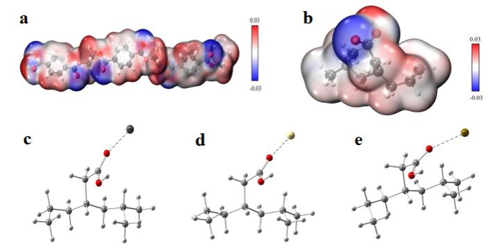 PET(n=3)的几何优化构型(a)和PP(n=3)的最稳定结构(b)的表面静电势图基于B3LYP/def2-TZVP水平上;最稳定结构中的含-COOH基团的PP(n=3)与Pb2+ (c)、Cd2+ (d)、Sr2+ (e)等阳离子配合物之间的优化配合物