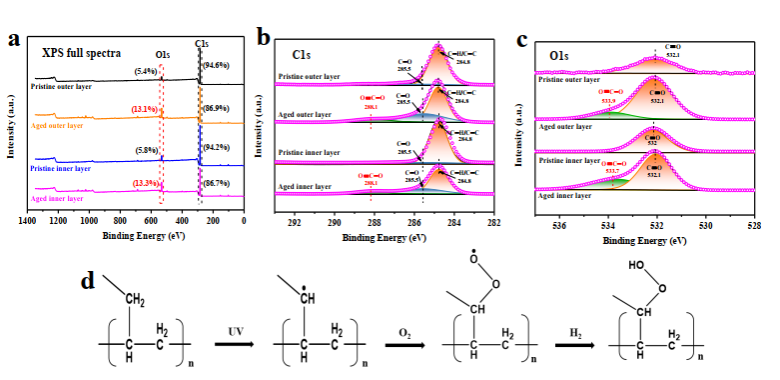 DFMs的XPS全谱图(a)、C1s谱图(b)、O1s谱图(c);DFMs在UV辐射下的老化机制(d)