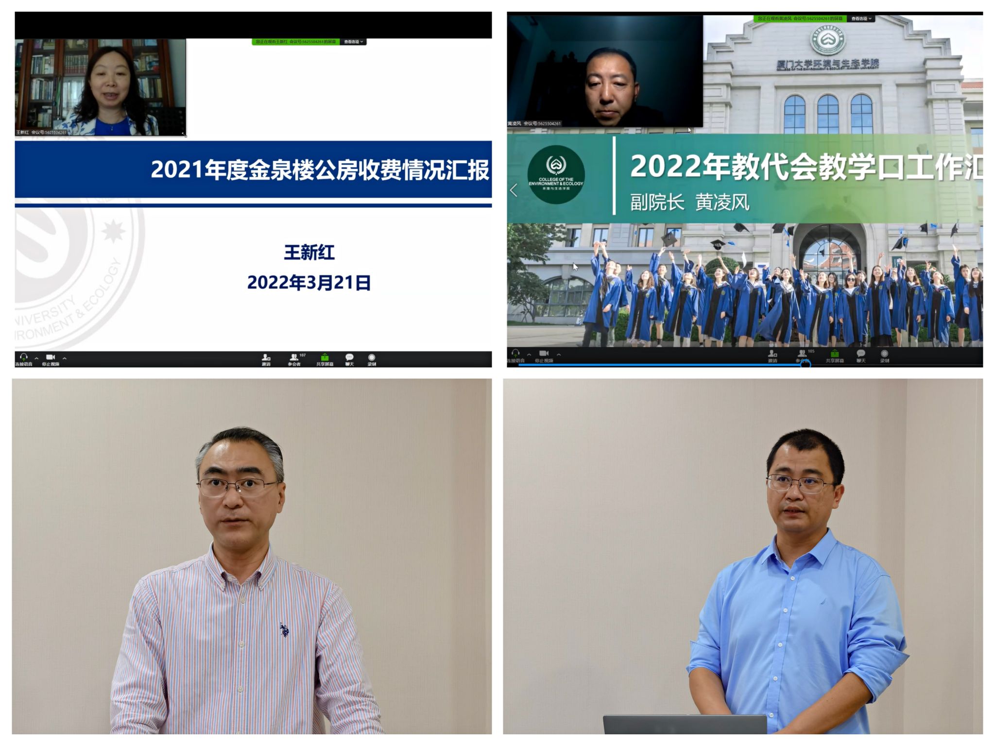 会议在雄壮的国歌声中开幕。根据议程安排,学院行政领导班子成员分别做了相关工作汇报。吕永龙院长作题为《一流学科建设与学院发展》的主题报告,他从学科发展现状及存在问题、一流学科建设目标与方案、启动实施内容与当前进展、近期重点任务与主要举措四个方面进行了详细分析和介绍,提出一流学科建设的目标方向和近期重点工作要求。王新红副院长作了2021年度财务收支及2022年度预算报告,通报了公房收费情况。黄凌风副院长汇报了本科生和研究生教学教育改革成效和下一步工作安排。于鑫副院长分析了学院的科研现状,提出提升科研水平和加强社会服务的思路举措。马剑副院长从聘任细则修订和专业技术人员绩效工资分配方案等方面,作了人事和科研平台工作的汇报。