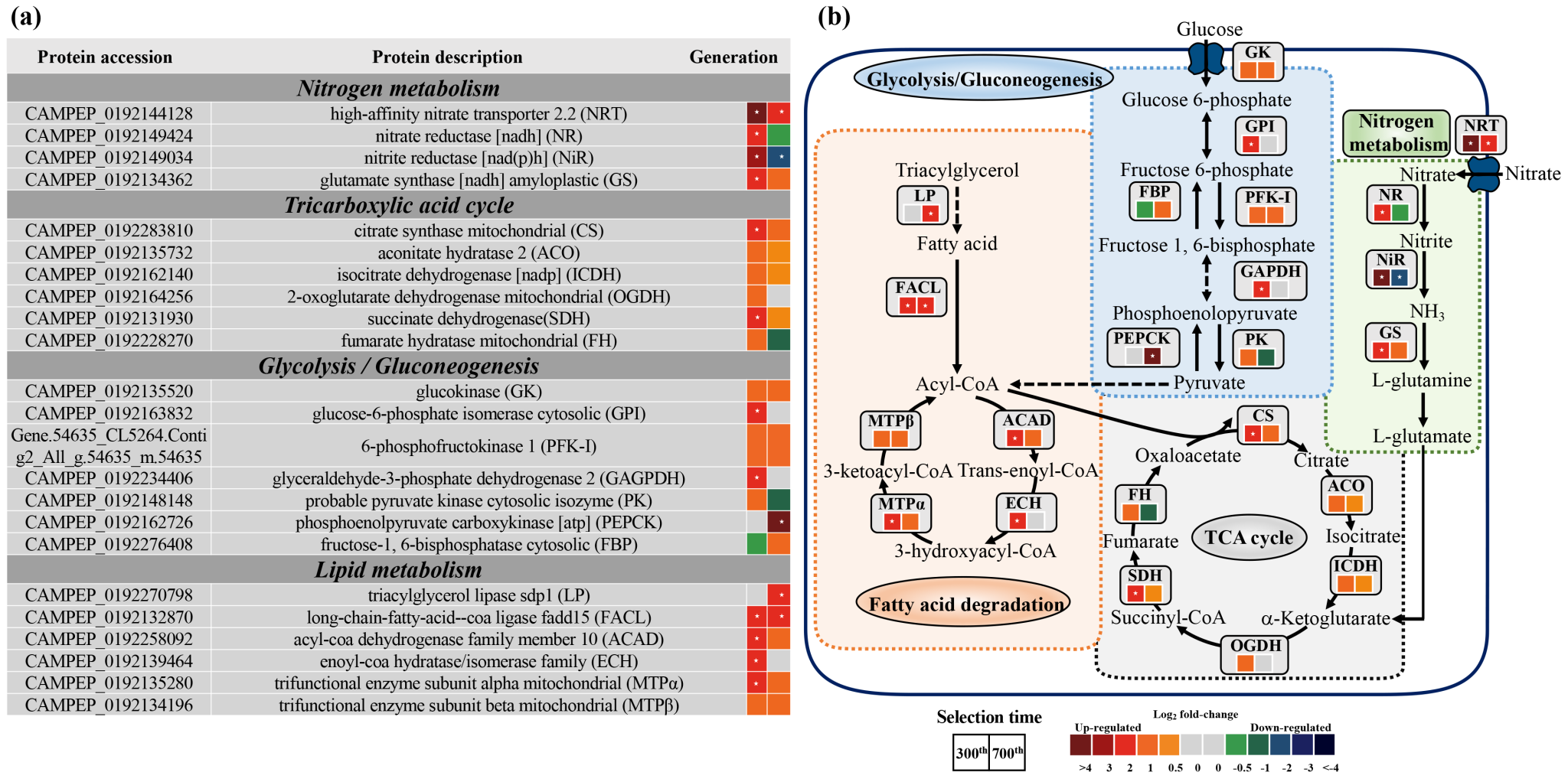 图2: 参与调控多尼骨条藻响应和适应海水升温的关键蛋白质及代谢途径