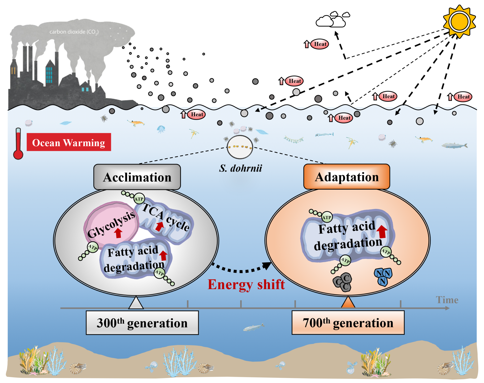 硅藻是海洋中最重要的浮游植物类群之一,贡献了约40%的海洋初级生产力,在海洋食物网和生物地球化学循环中扮演重要角色。温度是影响浮游植物生长、繁殖、代谢和生产力的重要环境因子。随着人类排放CO2等温室气体的增加,海洋吸收了大量热量致使海水升温,从而导致海洋暖化。据预测,在本世纪末海水温度将上升2.6-4.8°C,这一变动将对硅藻的生理代谢、生长繁殖和地理分布等造成显著影响。然而,目前大部分研究都仅关注其短期响应效应,极少探究其长期适应性,因而对硅藻究竟能否适应未来海洋暖化存在争议。此外,硅藻对海水升温的响应和适应机制还缺乏分子水平上的深入研究。