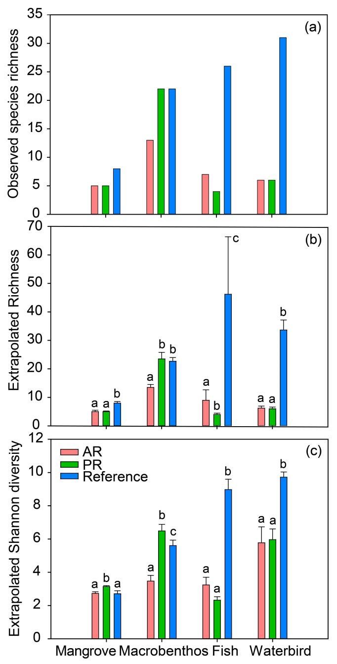 结果表明,经过20多年的恢复,自然退塘区和人工退塘区中多数生物类群的多样性基本无显著差异(图2、图3),说明人工种植在一定程度上并未起到促进红树植物及生物多样性恢复的作用。总体上,对照区的生物多样性高于退塘区,说明尽管经过20多年的恢复,退塘区的生物多样性依然无法达到天然红树林湿地的水平,表明人类活动导致的生物同质化现象仍然明显。此外,研究区内大多数生物类群的β多样性为周转大于嵌套,表明生物类群的生态过程由决定性过程占主导,β多样性主要受环境过滤等因子的影响(图3)。
