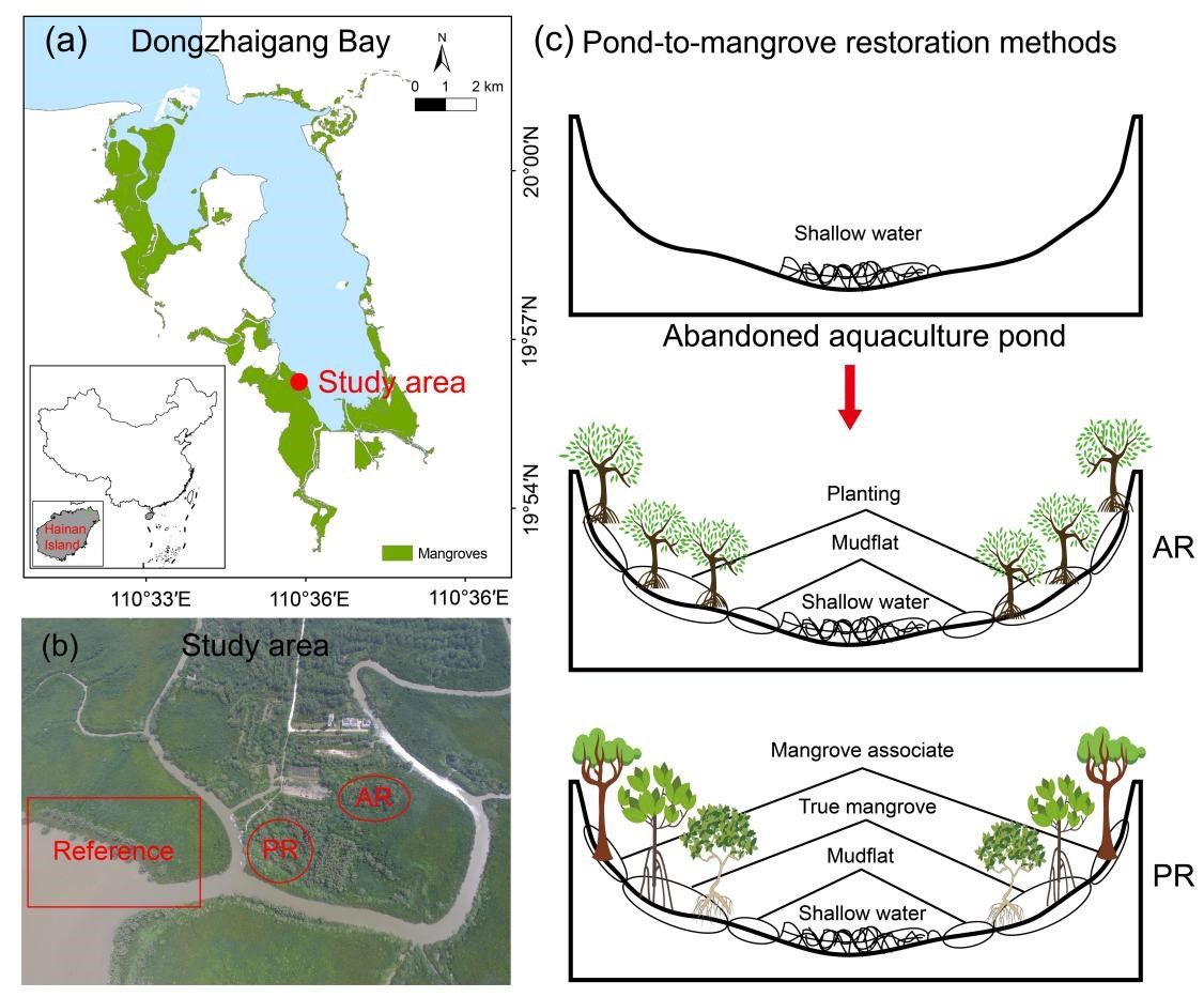红树林是地球上生物多样性最丰富、生态系统服务功能价值最高的生态系统之一。然而,由于人类活动和全球气候变化的双重影响,全球大部分红树林均面临着面积下降、生态系统功能退化、保护不充分和修复手段不当等问题。其中,围塘养殖是造成红树林面积减少、生物多样性降低的最主要因素。在中国乃至东南亚国家存在大面积闲置的养殖塘,围垦前大部分为天然红树林,这些区域为退塘还湿的开展提供了机会和条件。退塘还湿已经成为中国红树林生态修复的主要任务。但如何科学有效地进行退塘还湿,目前仍然缺乏可实际操作的成功案例和理论依据,难以为退塘还湿的大规模实施提供准确而及时的决策支持。