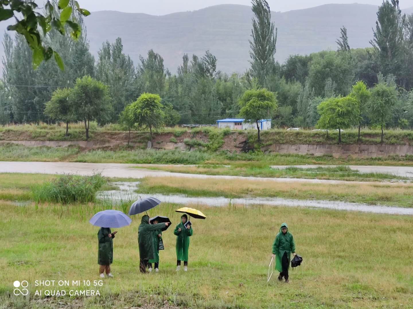 2020年8月,学院绿色先锋实践队师生赴宁夏隆德开展渝河流域自然生态环境调查(左)、与隆德县相关部门召开座谈会(右),并编制《渝河湿地公园生物多样性》报告,为渝河湿地核心保护区规划和生态保护提供科技支撑