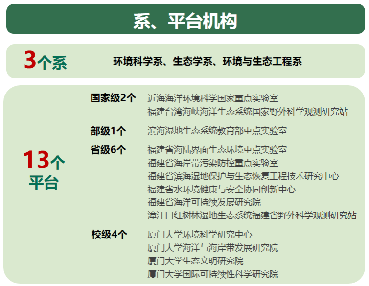 生态学系:成立于2012年,拥有生态学一级学科博士点。瞄准国际生态学科发展前沿和中国生态保护需要,重点开展湿地生态、海洋生态、保护生态、分子生态以及环境污染生态治理与工程技术等研究,培养从事生态保护与可持续发展所需复合型高层次人才,是我国生态学和生态工程研究和人才培养的重要基地。